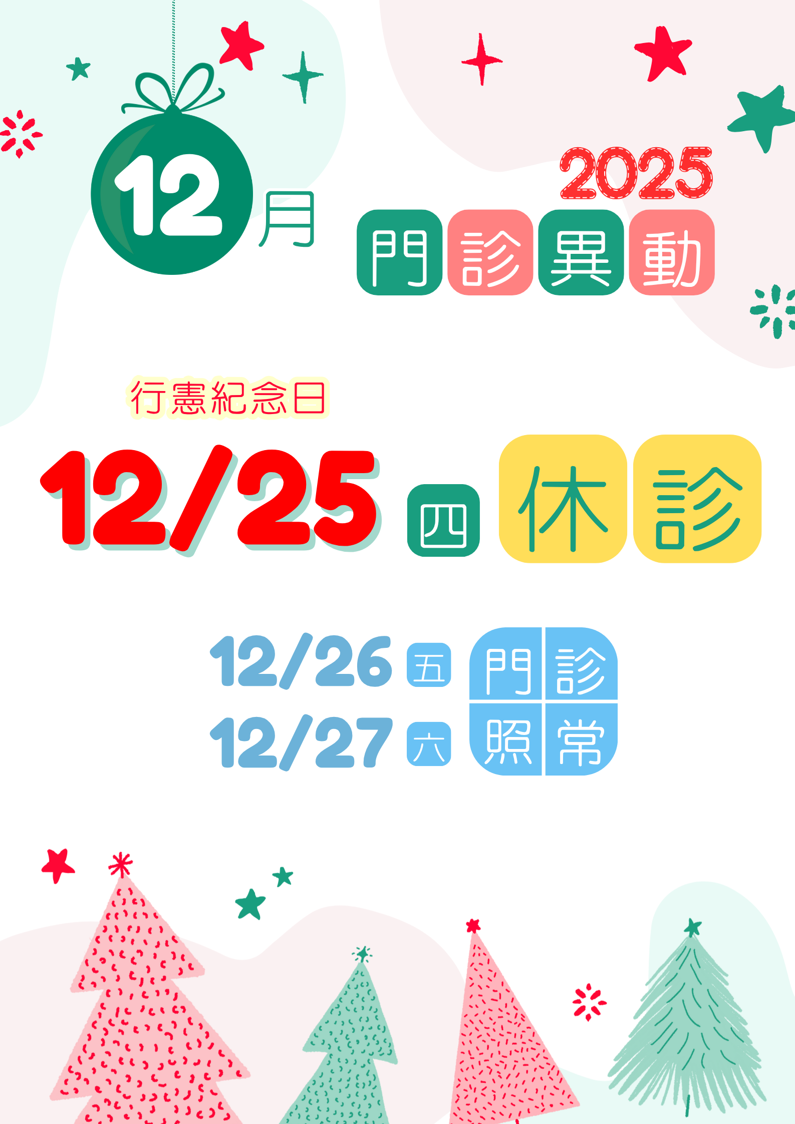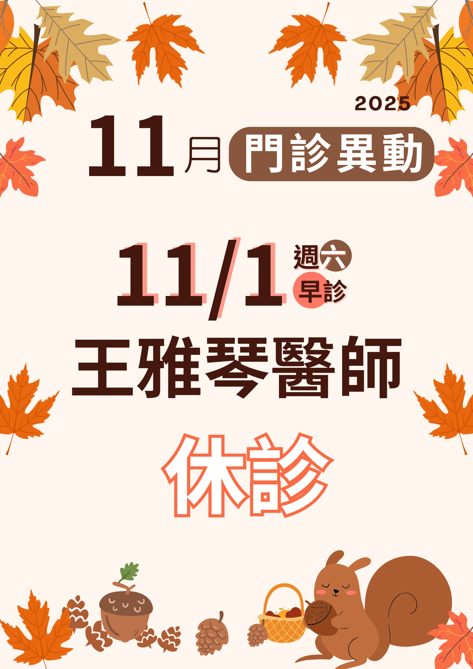 採預約制初複診皆可預約。預約時間為『報到時間』(非看診時間),依預約時間的報到順序安排看診。醫師問診仔細,看診速度依當診病人狀況而定,敬請耐心等候114年11月、12月門診異動公告 ,如下